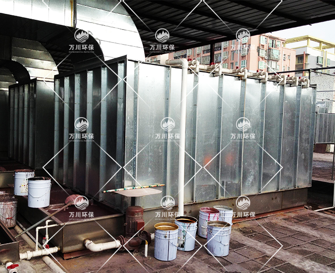 均勻安裝多層濕簾層和過濾層。水性過濾棉,不吸水,漆粉附著表面時,會隨水流受重力作用被洗滌至循環水池,不易堵。濕簾層經水洗后會在面上形成一層水膜,漆粉經過該層被水膜黏附,對降低氣體流速,加長廢氣在噴淋塔的洗滌時間有重要作用。廢氣經過除霧層(即氣水分離)后,再進行活性炭吸附塔吸附。該法具有處理效果高,運行穩定優點。